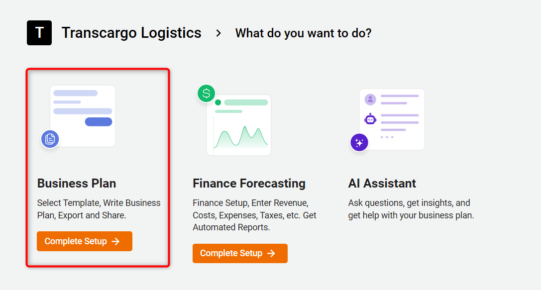 After choosing the desired option, completing the process will automatically take you to the business plan builder page.