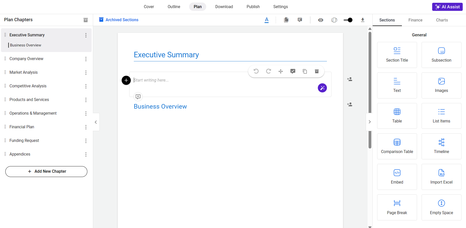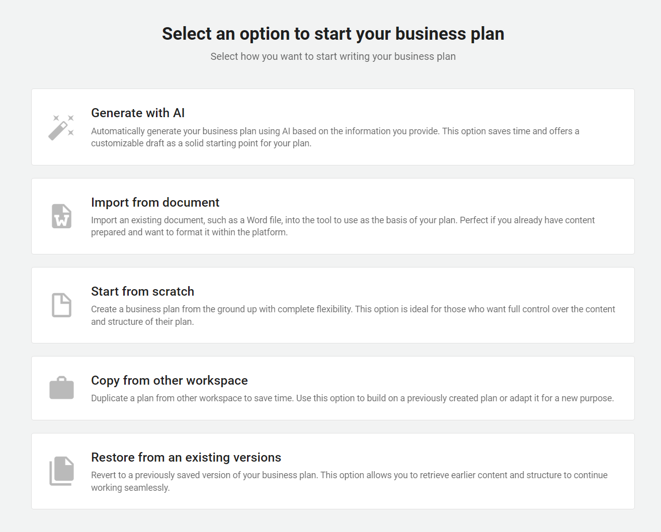 - Start from Scratch: Ideal for those who have a clear vision and prefer to build their business plan piece by piece. This option allows you the freedom to structure your plan exactly how you see fit, without any predefined sections or prompts.