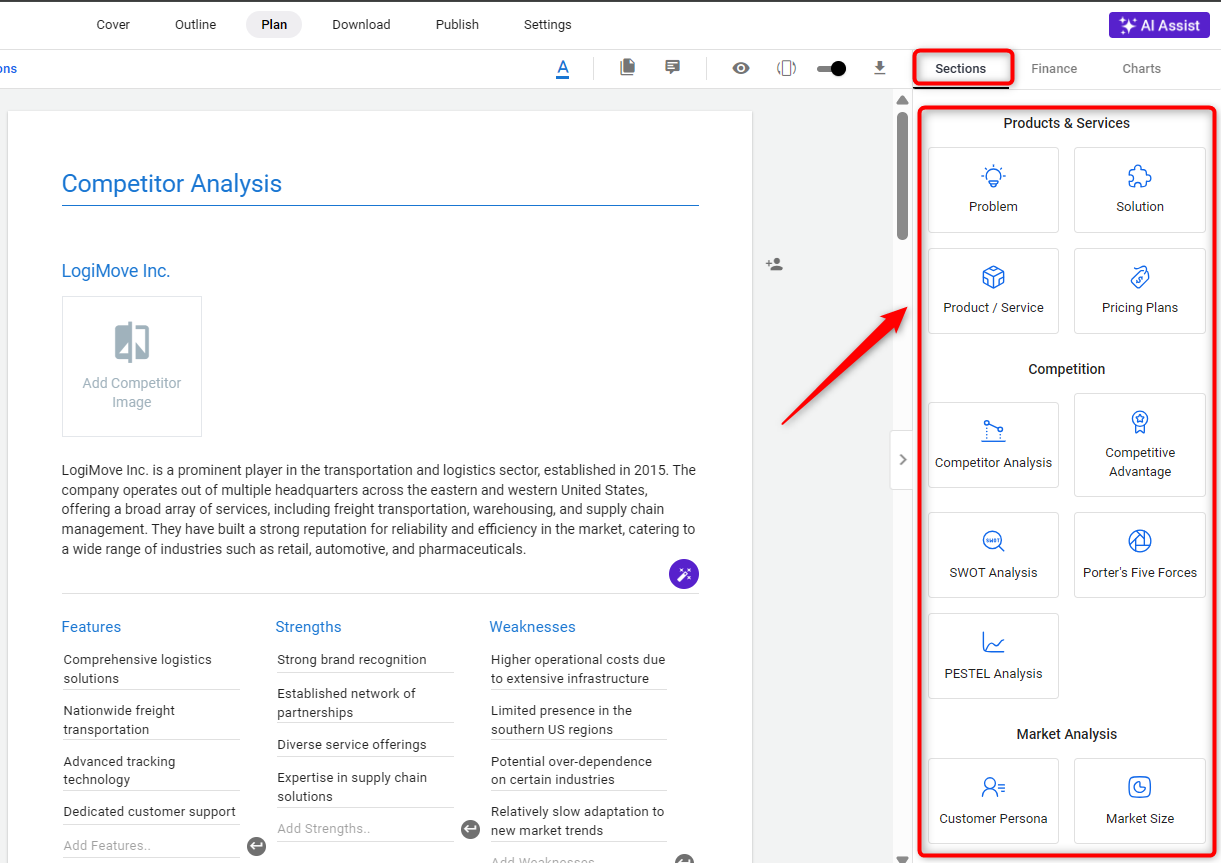 Within it, locate the 'Sections' option on the left sidebar. This menu hosts a variety of topics and section types categorized under headings like General, Executive Summary, Business Overview, Competition, and Market Analysis.