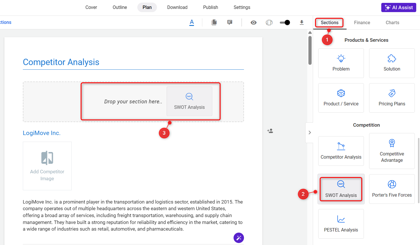 To add a specific section, for instance, 'SWOT Analysis', click on it and then drag and drop it to the desired location in your business plan.