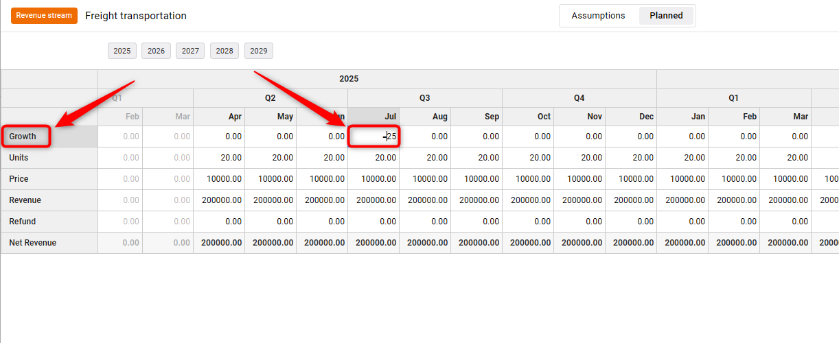 Enter the percentage (%) value for the expected growth rate. The system will automatically update future projections based on the percentage you input.