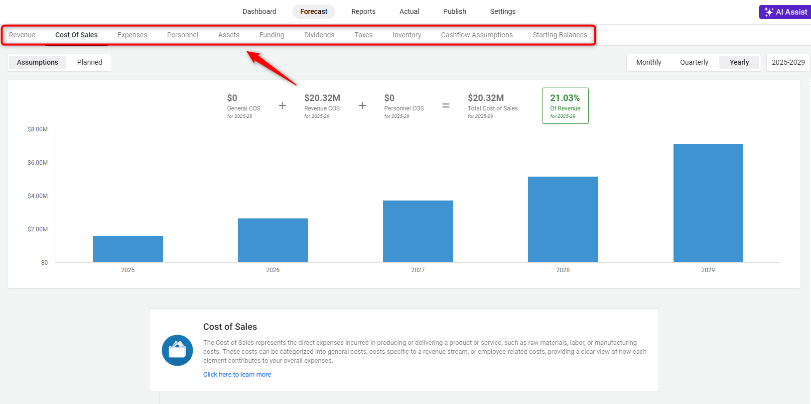 Open the finance forecast module and here, generate multiple finance streams tailored to different scenarios across key financial categories like Revenue, Cost of Sales, Expenses, and personnel etc.
