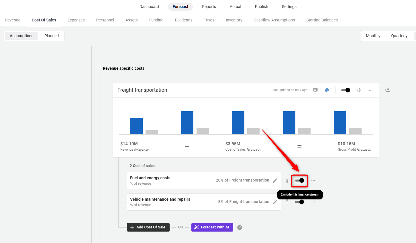 You can set up various financial scenarios by adding multiple finance streams to your Revenue, COS, Expenses, and Working Capital. Then you can Include/ Exclude these streams via toggle on or off to simulate various scenarios and see the effects on your financials.