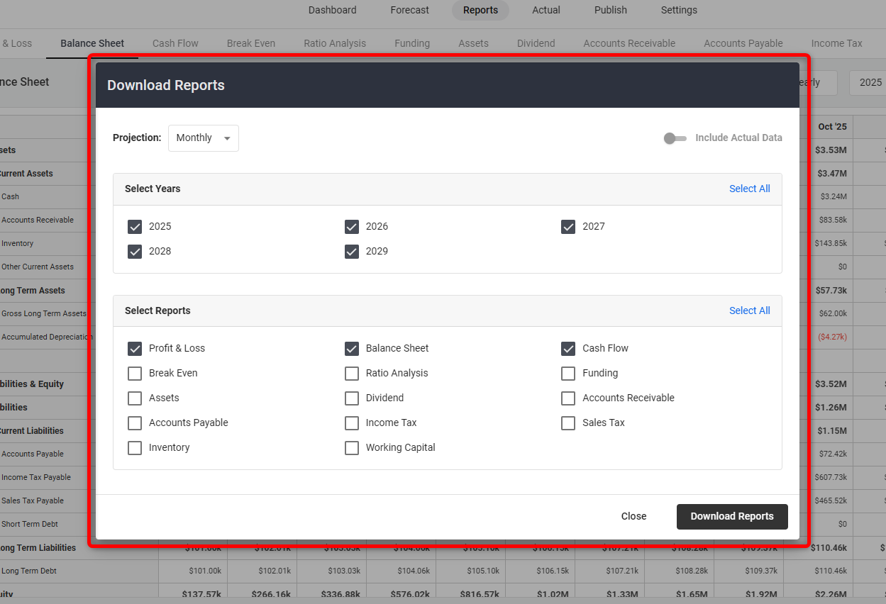 After setting up your scenarios, you have the option to export or download the finance reports specific to each scenario.
