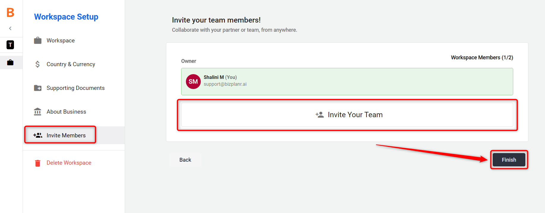 In the final step, under the Invite Members section, you can invite your teammates, colleagues, or business partners to collaborate within the workspace.