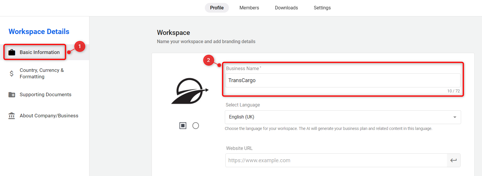 On the next page, the Basic Information section is selected by default. On the right side, update the Business Name field to rename your Workspace.