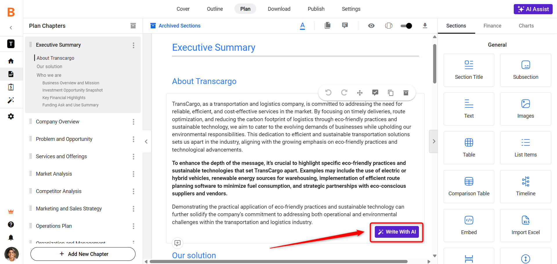 The AI Writing Assistant is your built-in content refinement partner. Whether you’re drafting a business plan or polishing key sections, simply click on the Write with AI option within your business plan text section.