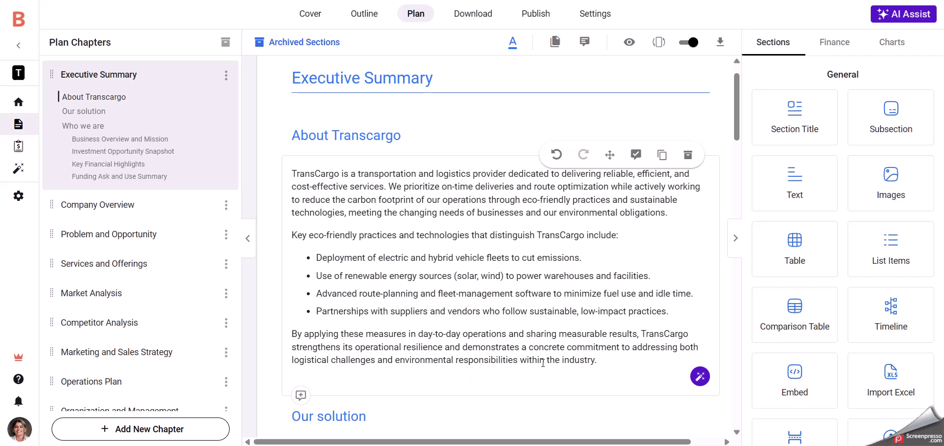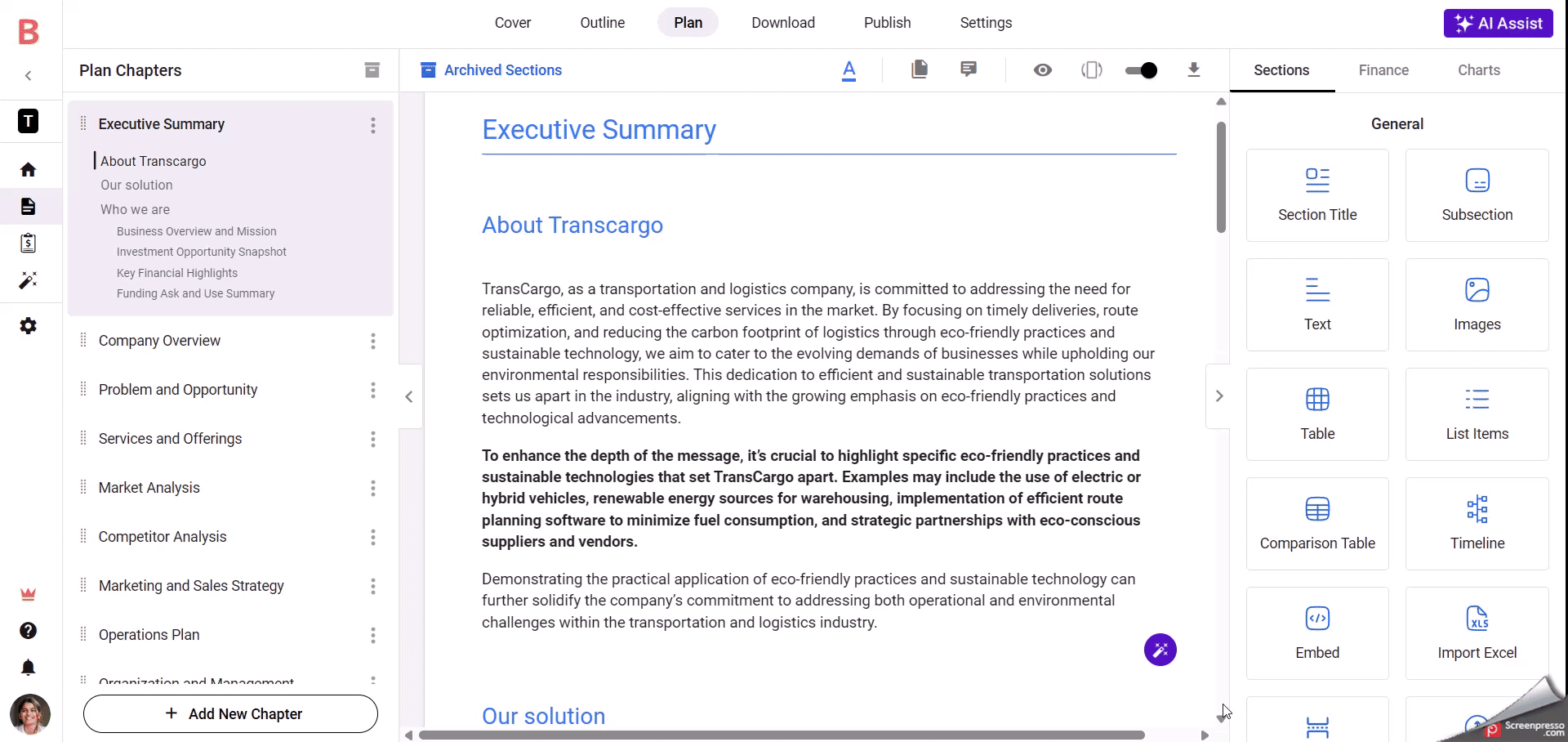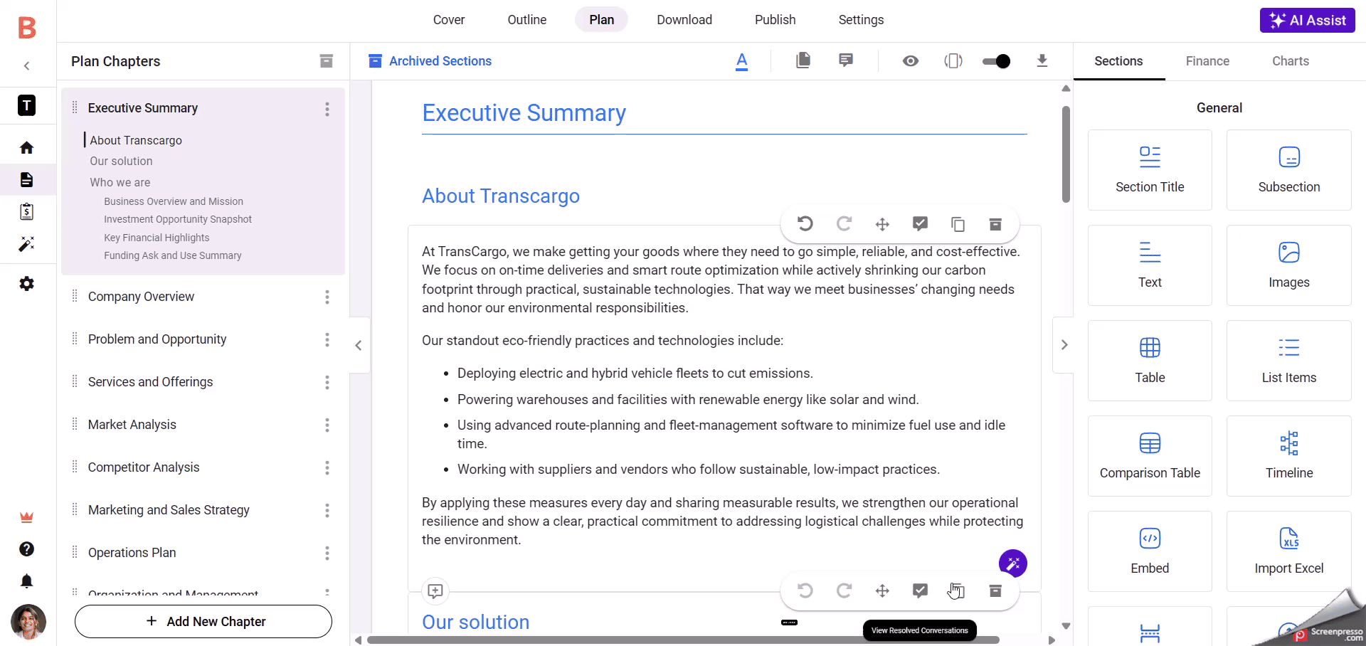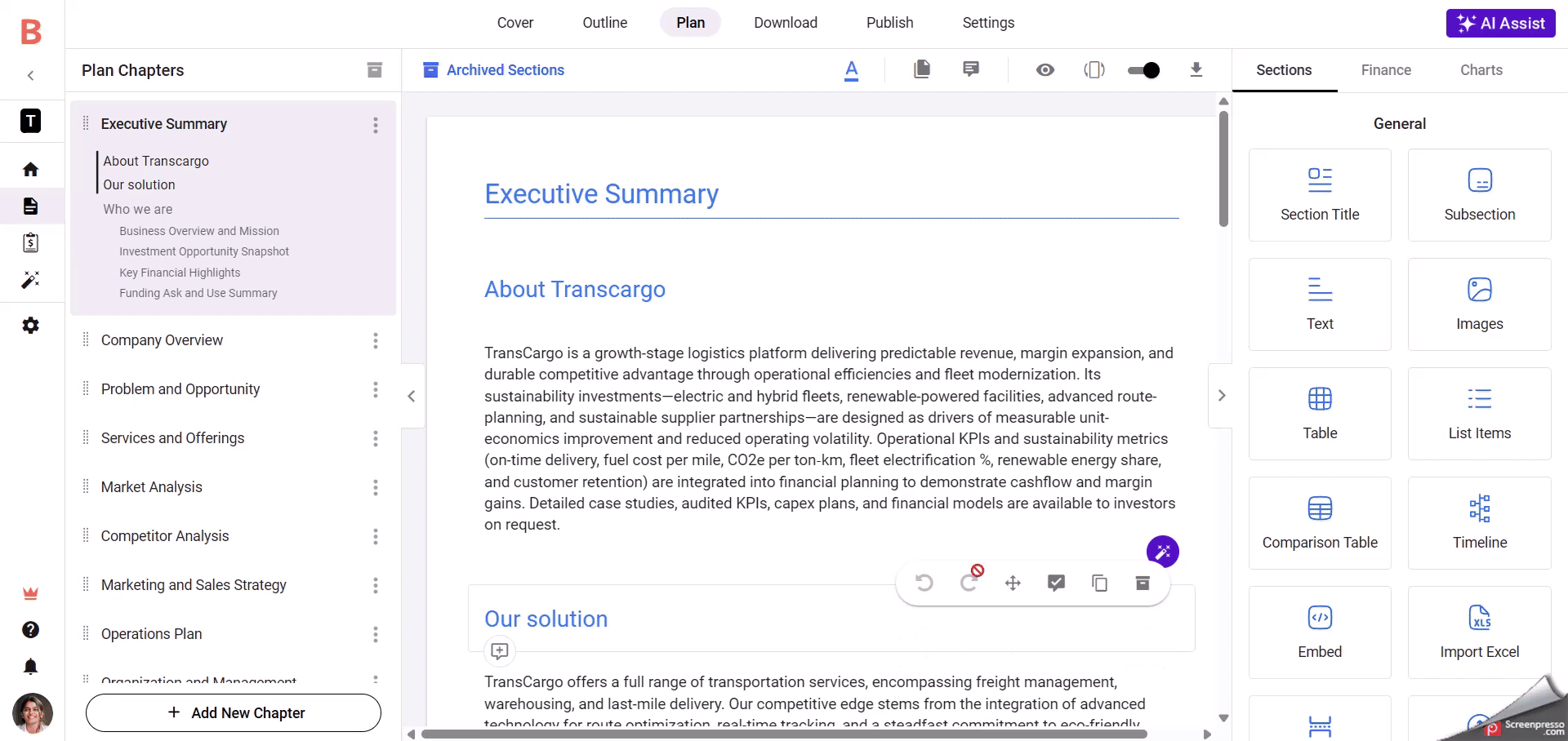 With the AI Writing Assistant, creating a professional business plan has never been easier. Whether you're refining content, changing tones, or tailoring it to your audience, this feature ensures that your ideas are clearly communicated and investor-ready.