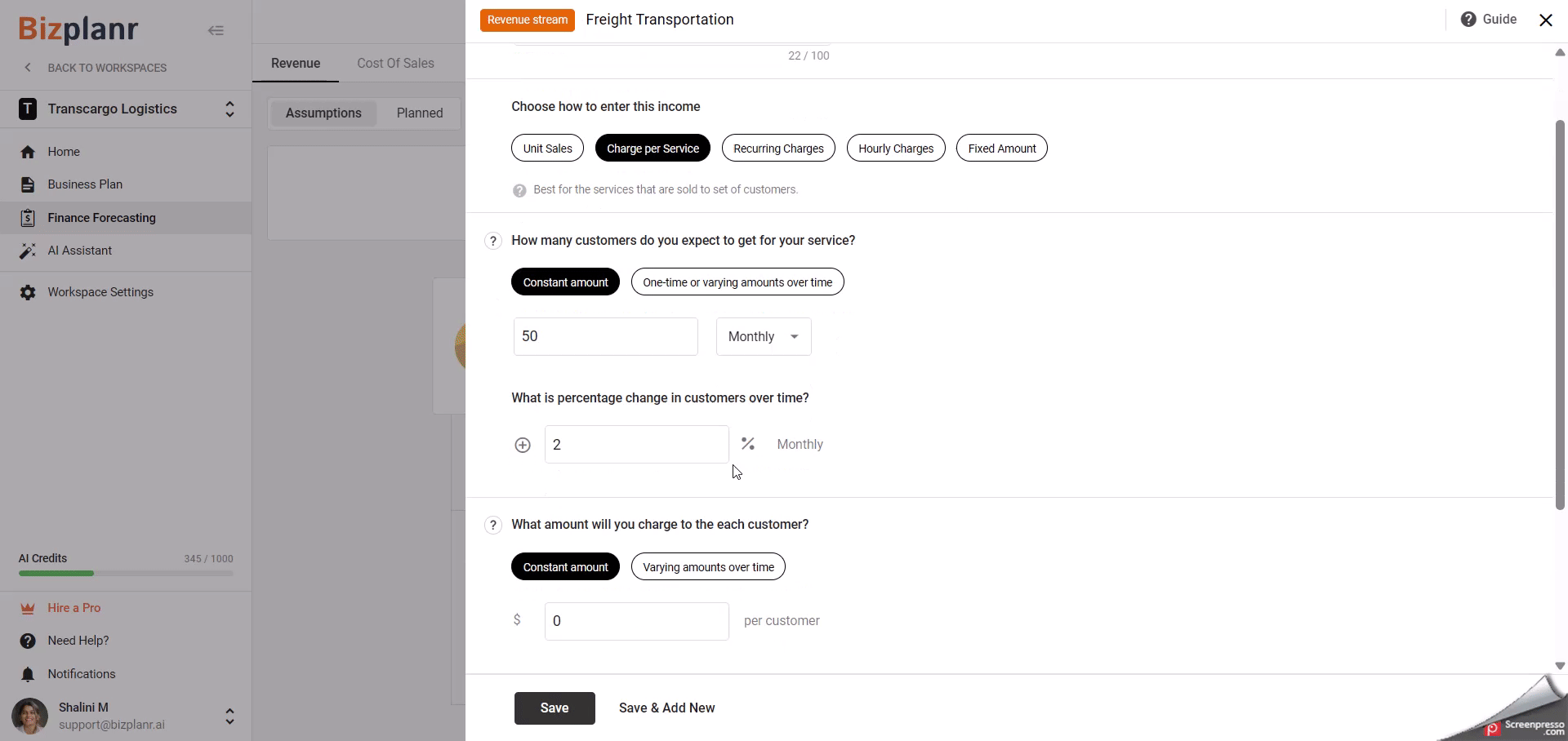 Let’s say you’re forecasting revenue for a logistics business. When setting up the entry, choose the option " One time or Varying Amounts Over Time" instead of a constant value. This option lets you fine-tune the forecast by entering specific values that may fluctuate month to month or based on the frequency.