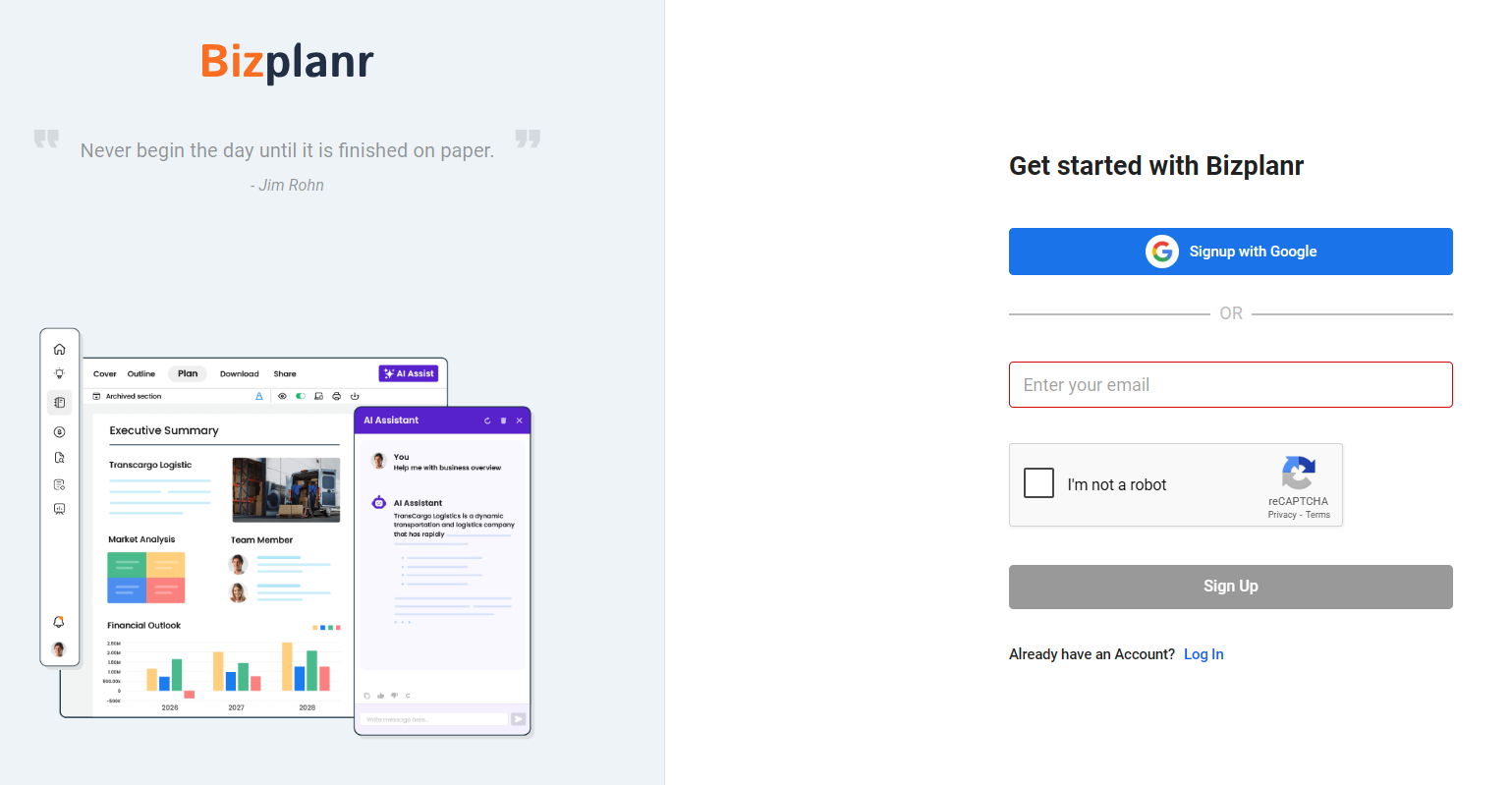 Create your Bizplanr account. If you don't already have an account, click here to sign up.