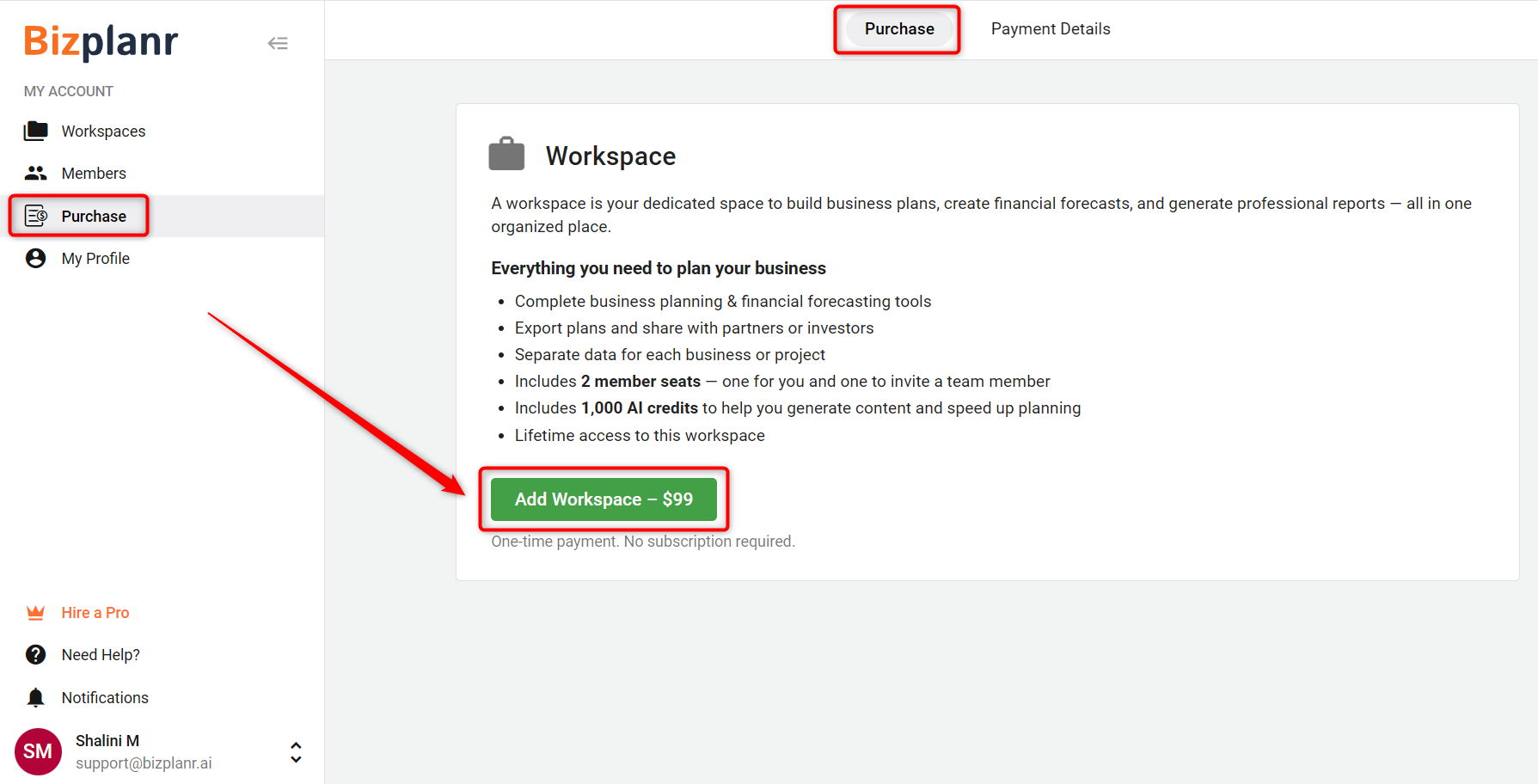 On the Purchase page, click on the Add Workspace button.